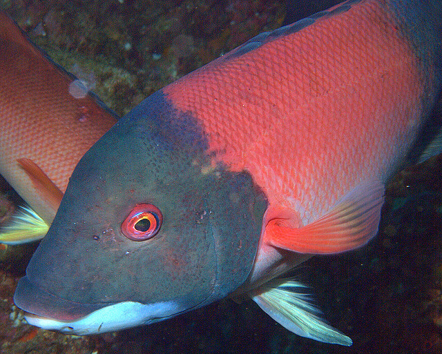 It’s still not fully understood what factors determine if and when a female changes into a male. Usually the largest and most dominant females are the ones to change. It probably is also determined by the existing sex ratio in the population and the environmental conditions, like how much food is available. When a female switches to male, it develops much brighter and more distinctive colors. The secondary males usually have a black head and tail with a middle band of bright red. They also grow a large hump on their heads. Males can grow up to three feet (90 cm) long and 36 lbs (16 kg). Individuals have been found to be 50 years old.