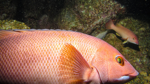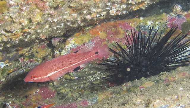 California sheephead (Semicossyphus pulcher) are a fish species with an interesting life history. It starts out simply enough with the adult males and females spawning to produce larvae. The larvae grow and become juvenile fish. They are a reddish color with a white stripe and black spots on their fins, as in the photo below.