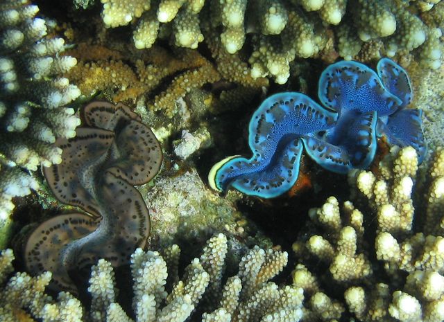 Although the clams do some filter feeding, they are mostly dependent on another source of energy: they have a symbiotic relationship with microscopic algae called zooxanthellae, just like corals do. The “zoox” perform photosynthesis, and transfer the sugars they produce to the clam, in exchange for a safe place to live within the clam. Some giant clams have another symbiotic relationship as well, with a type of small crab that can live inside the mantle cavity.