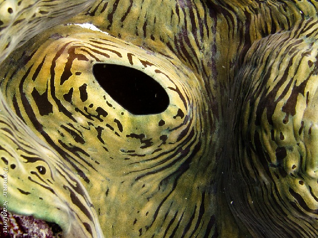 An up-close look at the incurrent siphon, through which water is inhaled, reveals the giant clam's gills. Photo by Dominic Scaglioni via Flickr, Creative Commons License.