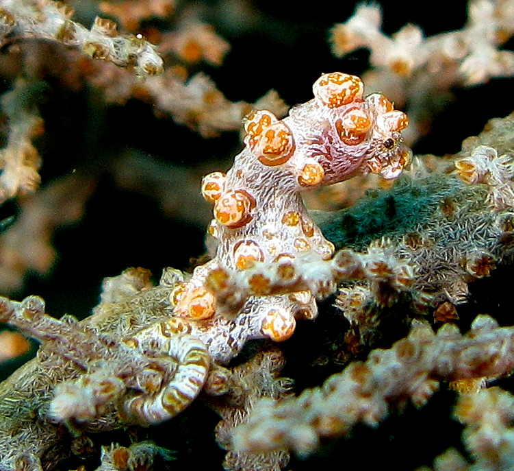 The Bargibanti pygmy seahorse reaches 2.4cm (1 inch) in length. It is found almost exclusively on gorgonians of the genus Muricella. The seahorse’s skin color matches its host gorgonian perfectly, which is usually soft pink or yellow. The knobs on its skin – called tubercles – help it blend in with the texture of the branches.