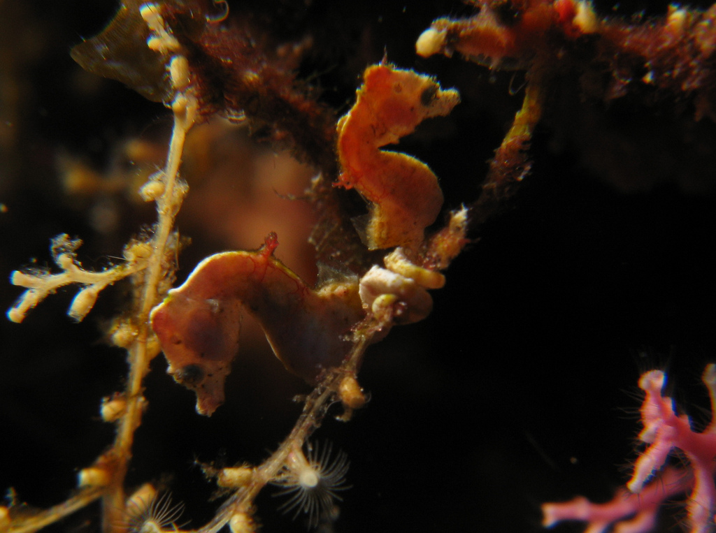 Meanwhile, Pontoh’s pygmy seahorse (Hippocampus pontohi) is usually less brightly colored. It tends to be white or brown colored, and its tubercles are smaller and fewer. It also doesn’t exclusively live on sea fans, and can be found on algae, hydroids, and bryozoans, as well.