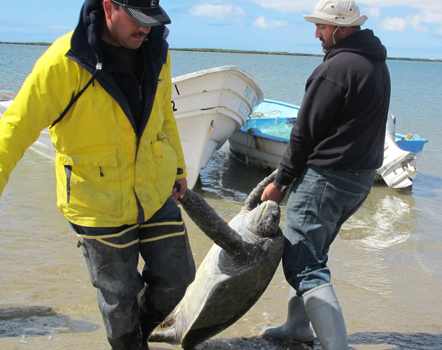 Claudia and Javier Villivicencio with Carl Safina and turtle tagged for research.