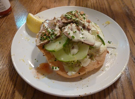 While dining at Slapfish, I questioned the server on the fish available and was told that the menu is written in chalk because it is constantly changing due to sustainability, seasonality and locality. The atmosphere of the restaurant is low-key and friendly; you order your meal at the counter and then take your seat with a number and wait for your food. The food comes out fast and appealing, and our first course of albacore tuna tostada with avocado wasabi cream was simply mouth-watering.