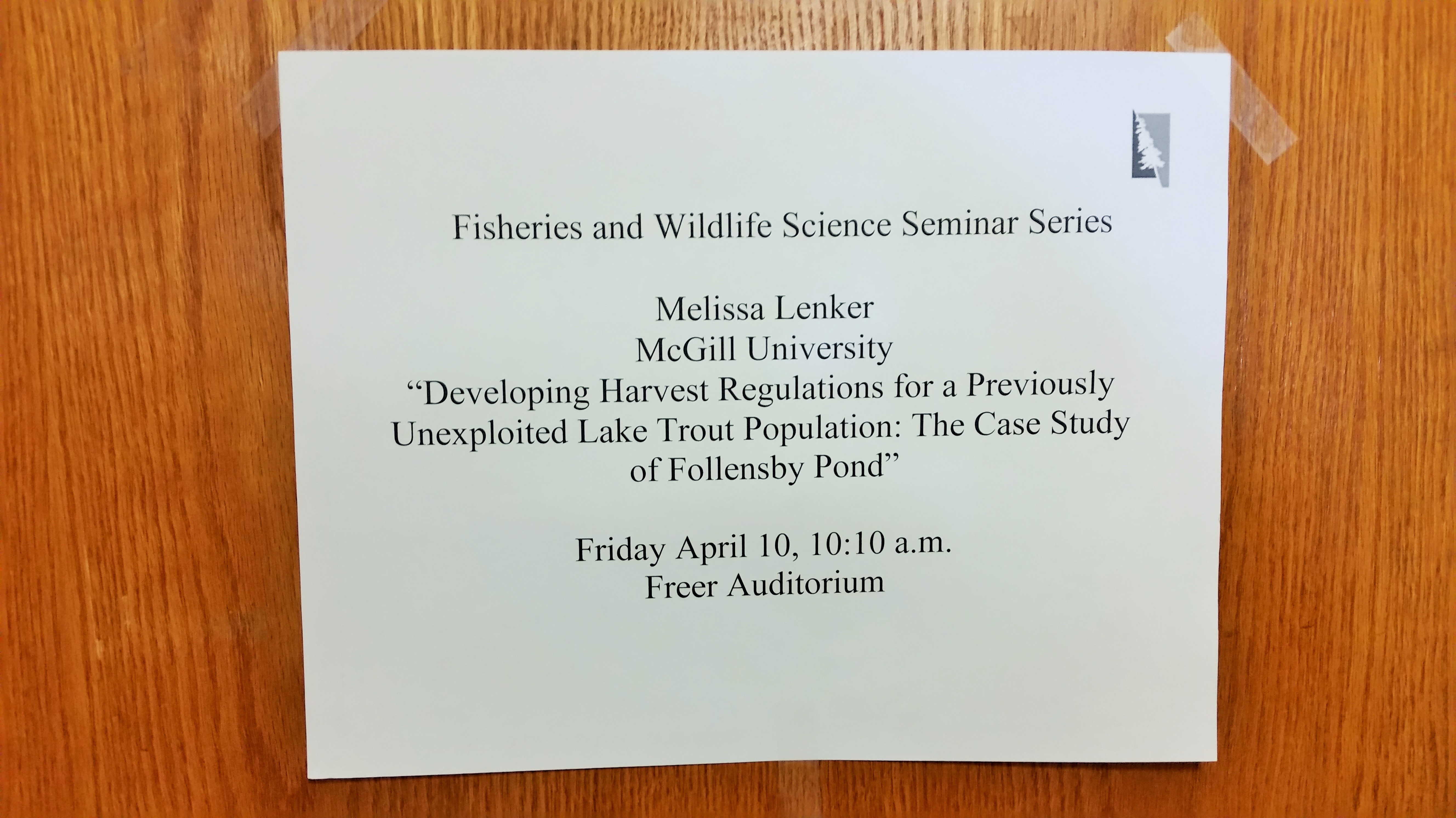 I heartily regret that it has been over two months since I last posted a blog. Graduate student life has proved extremely time-consuming of late. The harsh winter weather slowly yielded to spring, and spring brought my final thesis committee meeting, a final thesis presentation in front of the entire Department of Natural Resource Sciences, and a guest lecture for the Fisheries and Wildlife Seminar at Paul Smith’s College in the Adirondacks.
