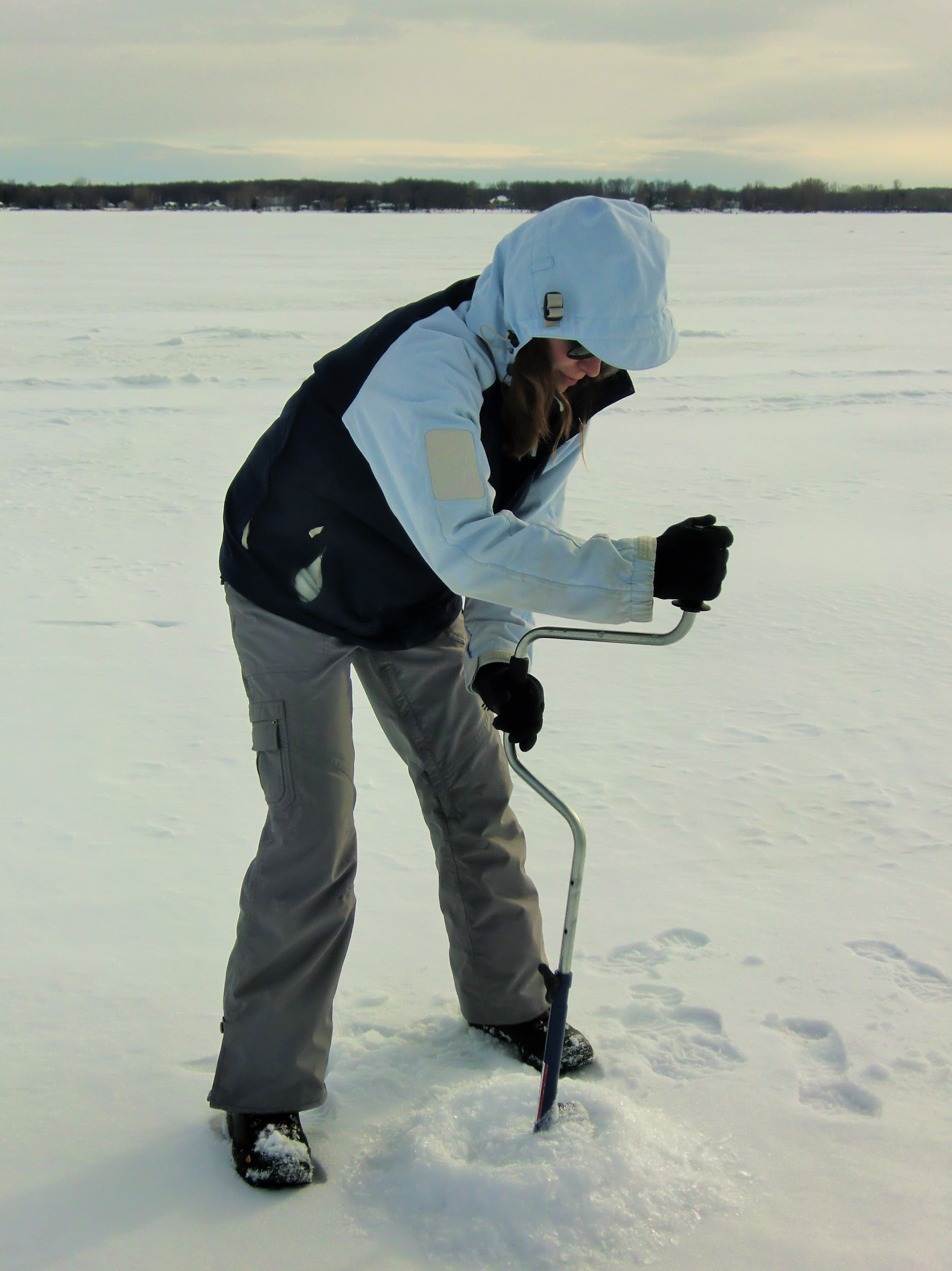 Lab ice-fishing trip. Here I am using an auger to drill a hole in the ice.