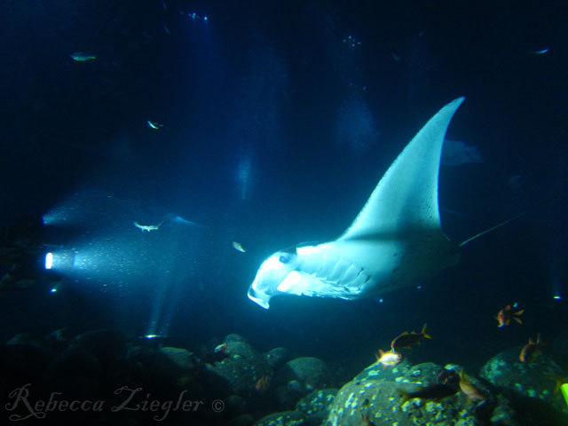 Another favorite spot is the site of the manta dive: Garden Eel Cove. It has a myriad of fish, eels and on my last trip- little oval squid during the sunset dive. The Outdoor Edventure program works deals with Jack’s Diving Locker to get the students fantastic discounted rates one their manta dives. The trip includes two dives (one evening and one night) with sandwich/snacks in between. It is one of my favorite trips, especially when getting paid! The first manta trip I did we had about 26 or so mantas gliding and spiraling over us. This last one had fewer mantas but was a whole different experience. We were the last ones in for the night dive. Typically the dive shops let you sit for about 30min in 30ft around these “campfires” made of lights that attract plankton and thus the mantas. Being the last ones in we thought we were late for the show. Turns out that there was a method to this madness. Being the last group in, means we are the last out. So when every other group and their lights were off and gone, we were left with the mantas and our dive lights. It was the equivalent to going backstage at a rock concert. There is nothing like an animal with a wing span twice your size, gliding over your head. I hope to do more manta dives in the future, and I hope the mantas will still be around to dive with!