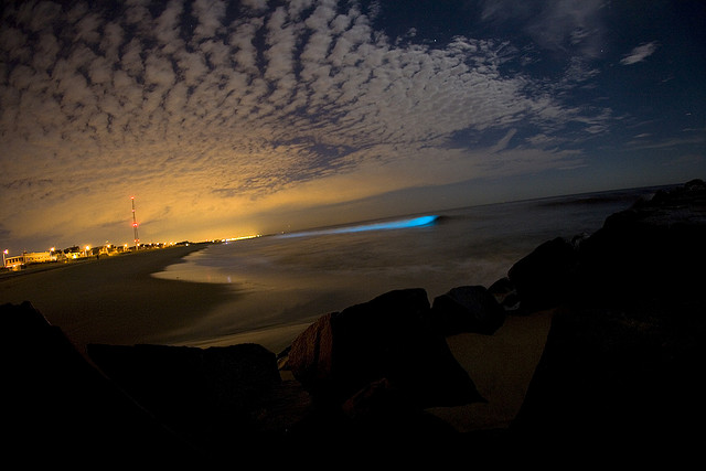 As waves stir up water containing dinoflagellates, the planktonic organisms emit light. Photo by catalano82 via Flickr, Creative Commons License.
