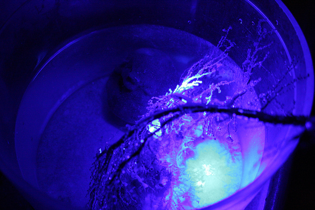 Corals and feather stars bioluminesce in a lab tank. Photo by NOAA Photo Library, Bioluminescence 2009 Expedition, NOAA/OER via Flickr, Creative Commons License.