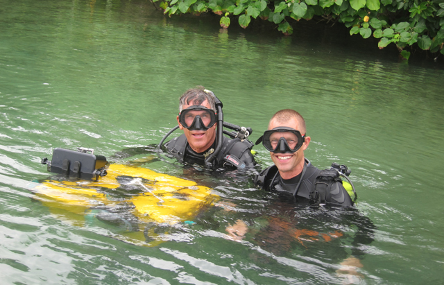 Rob Walker, left, and Sam recovering the IMAX camera.