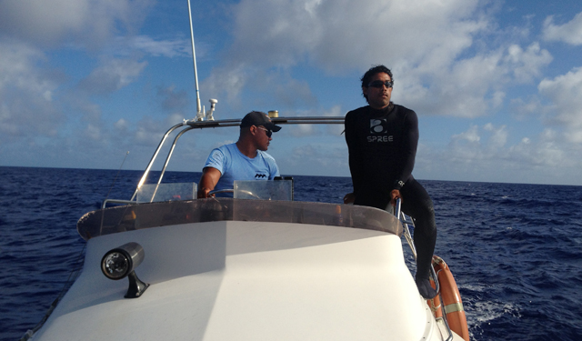 Ali, Captain of the Dream Catcher, left, and Musu, whale guide and free diver, at work.
