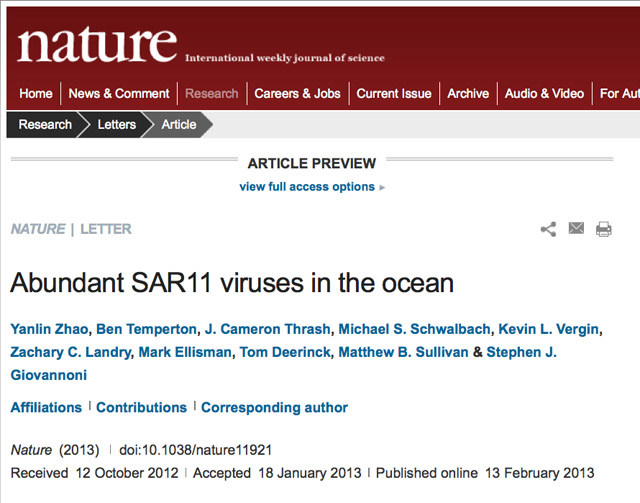 Reference: Zhao, Yanlin*, Ben Temperton*, J. Cameron Thrash, Michael S. Schwalbach, Kevin L. Vergin, Zachary C. Landry, Mark Ellisman, Tom Deerinck, Matthew B. Sullivan and Stephen J. Giovannoni. (2013) Abundant SAR11 viruses in the ocean. Nature. doi: 10.1038/nature11921. (*Equal contribution)